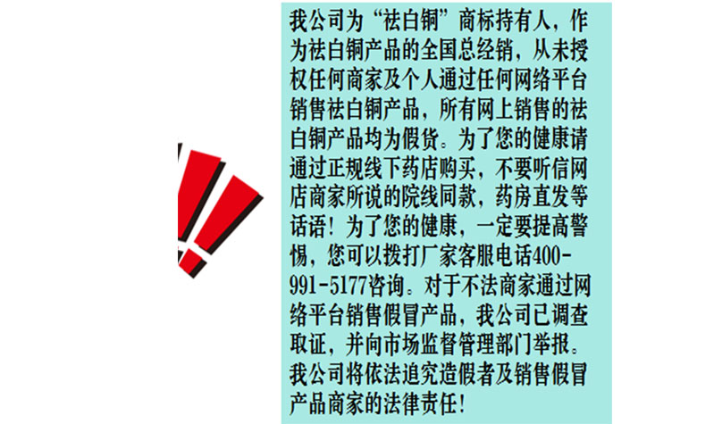 我公司从未授权任何公司及个人通过网络平台销售驱白铜皮肤液体敷料、醒莱液体皮肤敷料产品。我公司有且仅有一个网络平台:京东驱白铜官方旗舰店。请顾客注意甄别,通过正规渠道购买产品,凡是通过拼多多,淘宝,咸鱼,转转购买的驱白铜皮肤液体敷料、醒莱液体皮肤敷料产品,均为假货。为了您的健康,请在当地药店购买,或者咨询我公司客服电话0431-88519366
